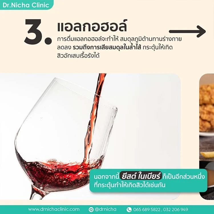 แอลกอฮอล์ ทำให้เกิดภาวะขาดน้ำที่จะส่งผลต่อระบบการผลัดเซลล์ผิว ทำให้ผิวมีความหมองคล้ำง่าย รวมถึงทำให้ภูมิต้านทานร่างกายต่ำลง ส่งผลให้ระบบความสมดุลต่างๆ มีความผิดปกติ เกิดการเสียสมดุลในล้ำไส้ เป็นสาเหตุที่ทำให้เกิดสิวได้