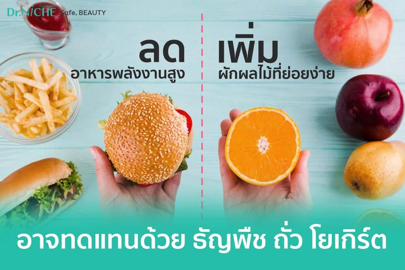 - เลือกทานของที่ย่อยง่าย เน้นผัก ผลไม้ ธัญพืช หลีกเลี่ยงอาหารมื้อดึกที่มีไขมันสูง น้ำตาลสูง