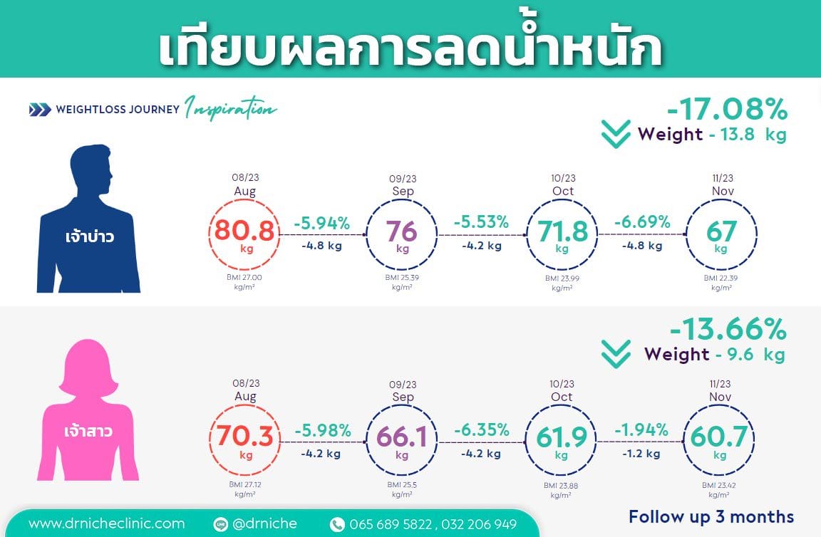 ทางคลินิกได้รับหน้าที่ดูแลเคสการลดน้ำหนักก่อนแต่งงาน โดยทั้ง 2 ท่านมีการเริ่มต้นลดน้ำหนักที่พร้อมกัน ใช้ระยะเวลาทั้งสิ้น 3-4 เดือน จนประสบความสำเร็จ