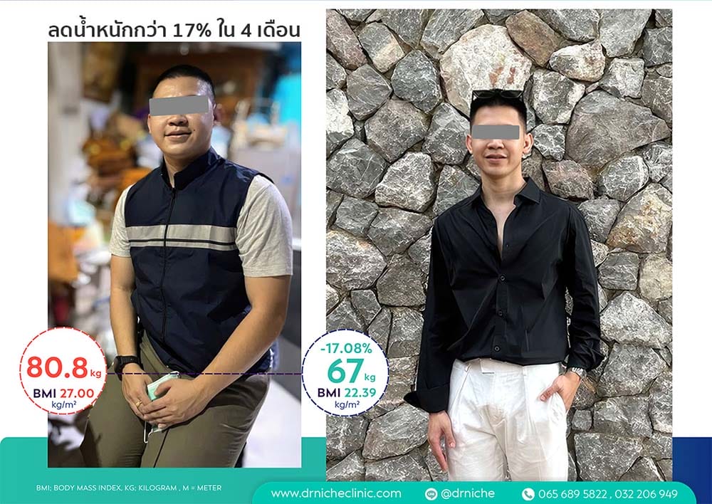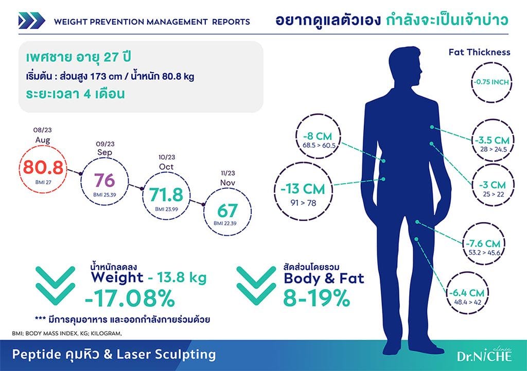 โดยสรุประยะเวลา 4 เดือน มีน้ำหนักลดลงมากกว่า 13.8 kg หรือคิดเป็น 17% มีสัดส่วนไขมันโดยรวมลดลงมากว่า 8-19% รอบเอวหายไปถึง 13 cm