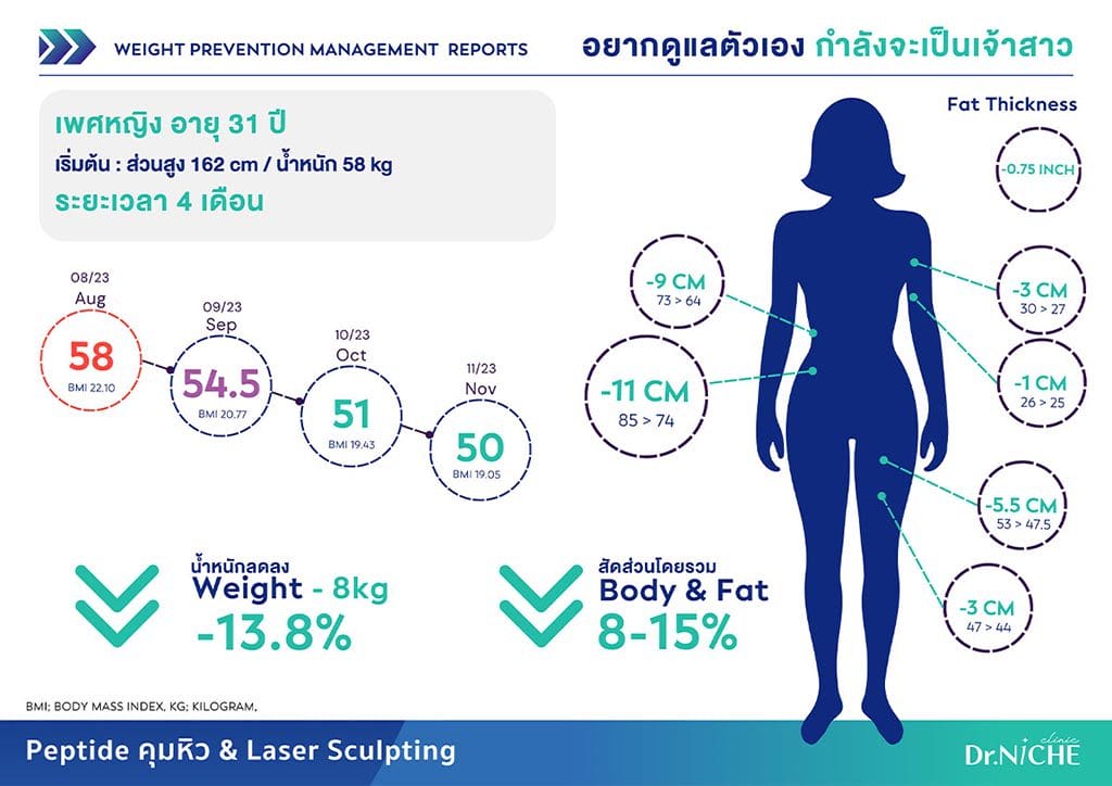 ตัวอย่างเคสการลดน้ำหนักด้วย Peptide คุมความหิว ร่วมกับการทำ SlimSure และการออกกำลังกายเป็นประจำ